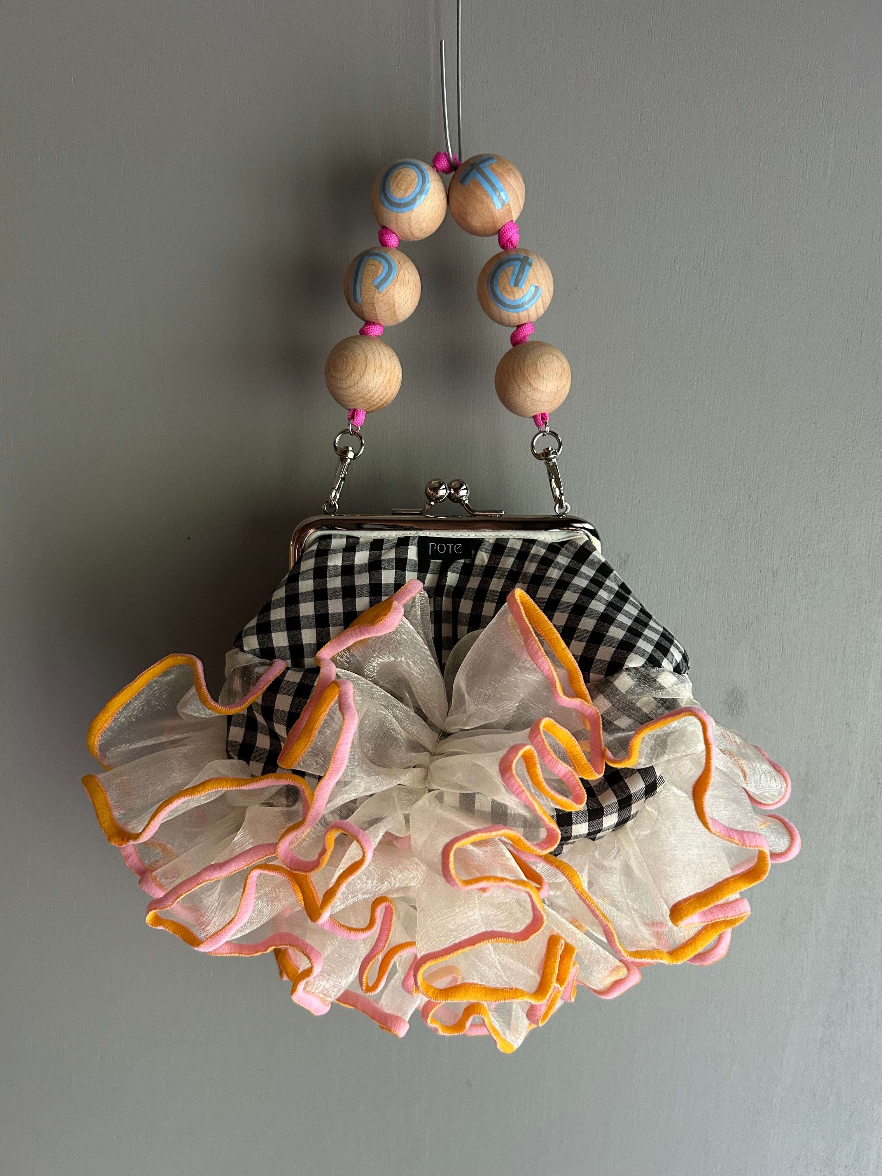 gamaparaは、可愛い持ち手が魅力のがま口bagです。パラコードとアクリルを使用した持ち手は、しっかりとした作りで、使い心地抜群!見た目の可愛さだけでなく、耐久性にも優れています。華やかなfrillデザインが、シンプルなコーディネートに彩りを与えてくれることでしょう。