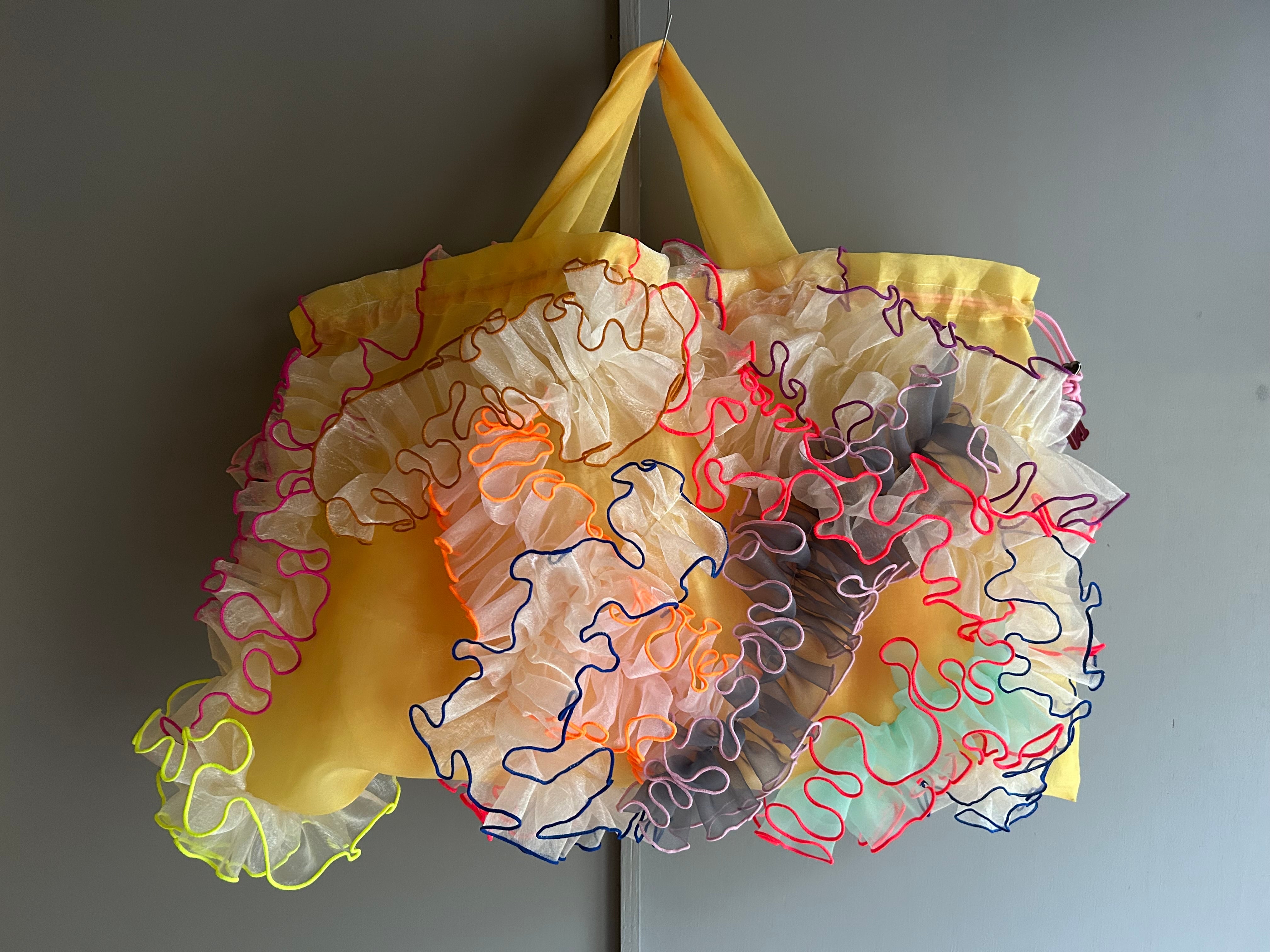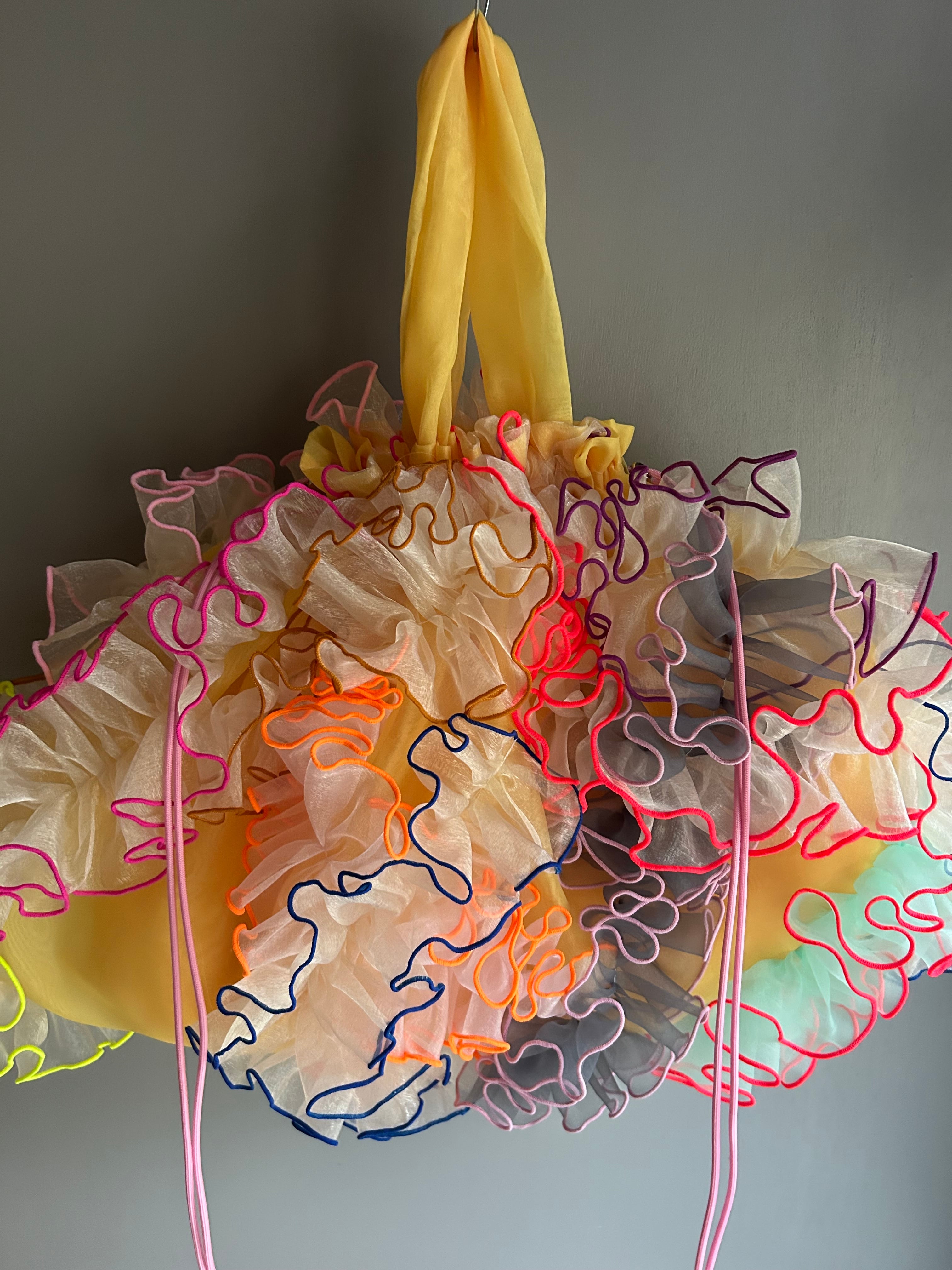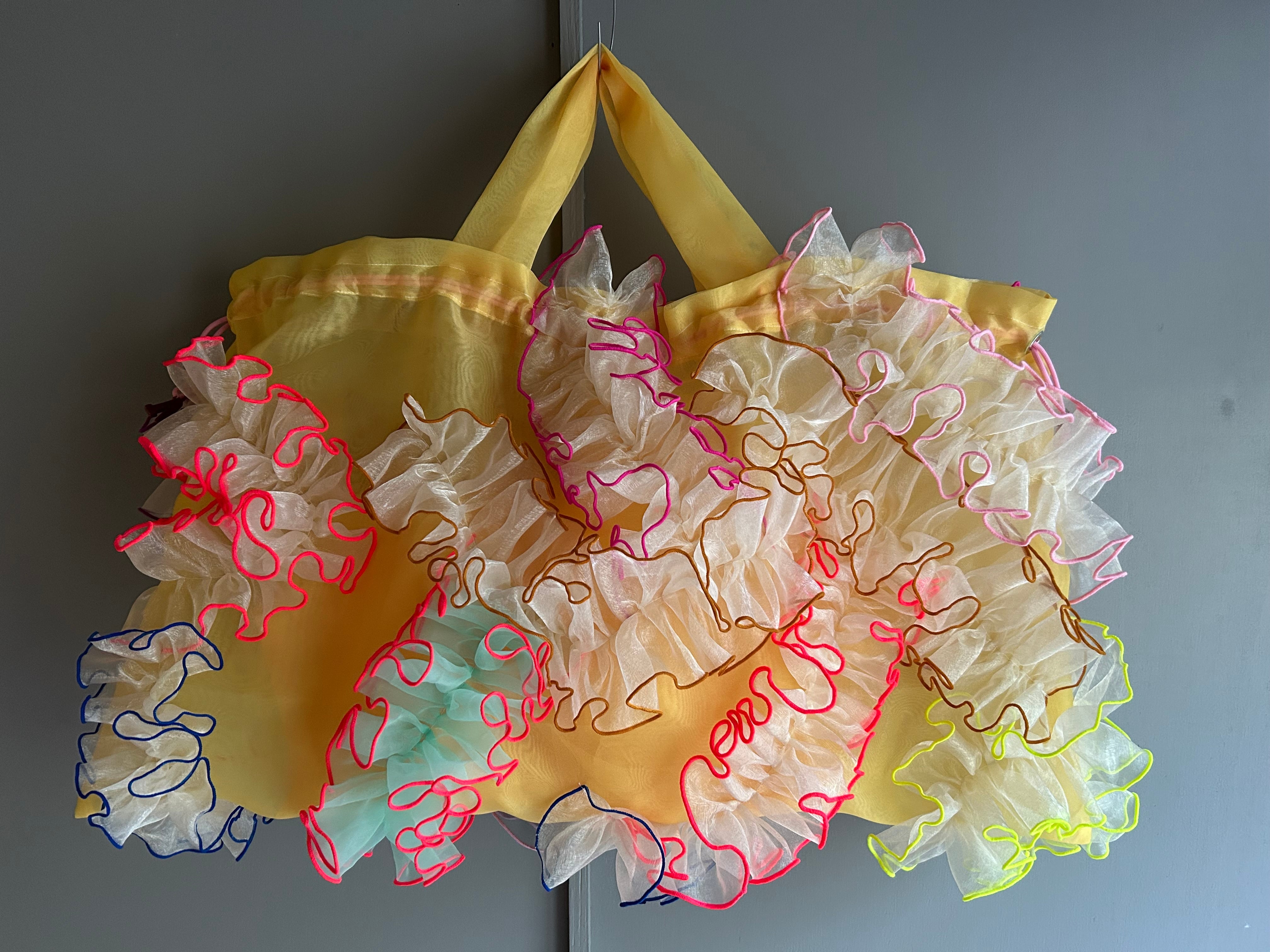 透け感のあるオーガンジー素材を重ね、縁にカラフルなラインを走らせた、一点もののバッグです。