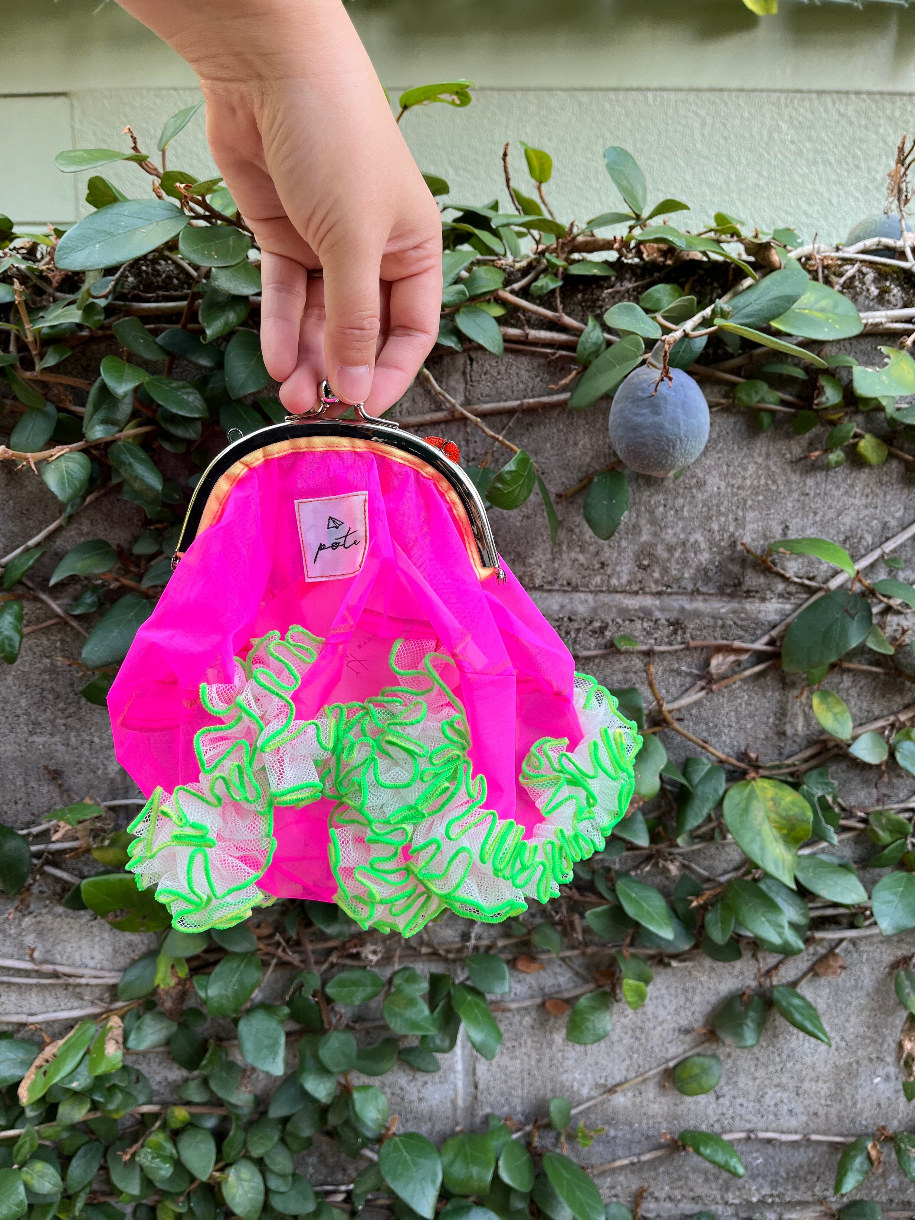 「gamapara」は、透け感のあるカラフルながま口バッグです。目を引く黄緑とピンクのコンビネーションで、おしゃれ度UP間違いなし!