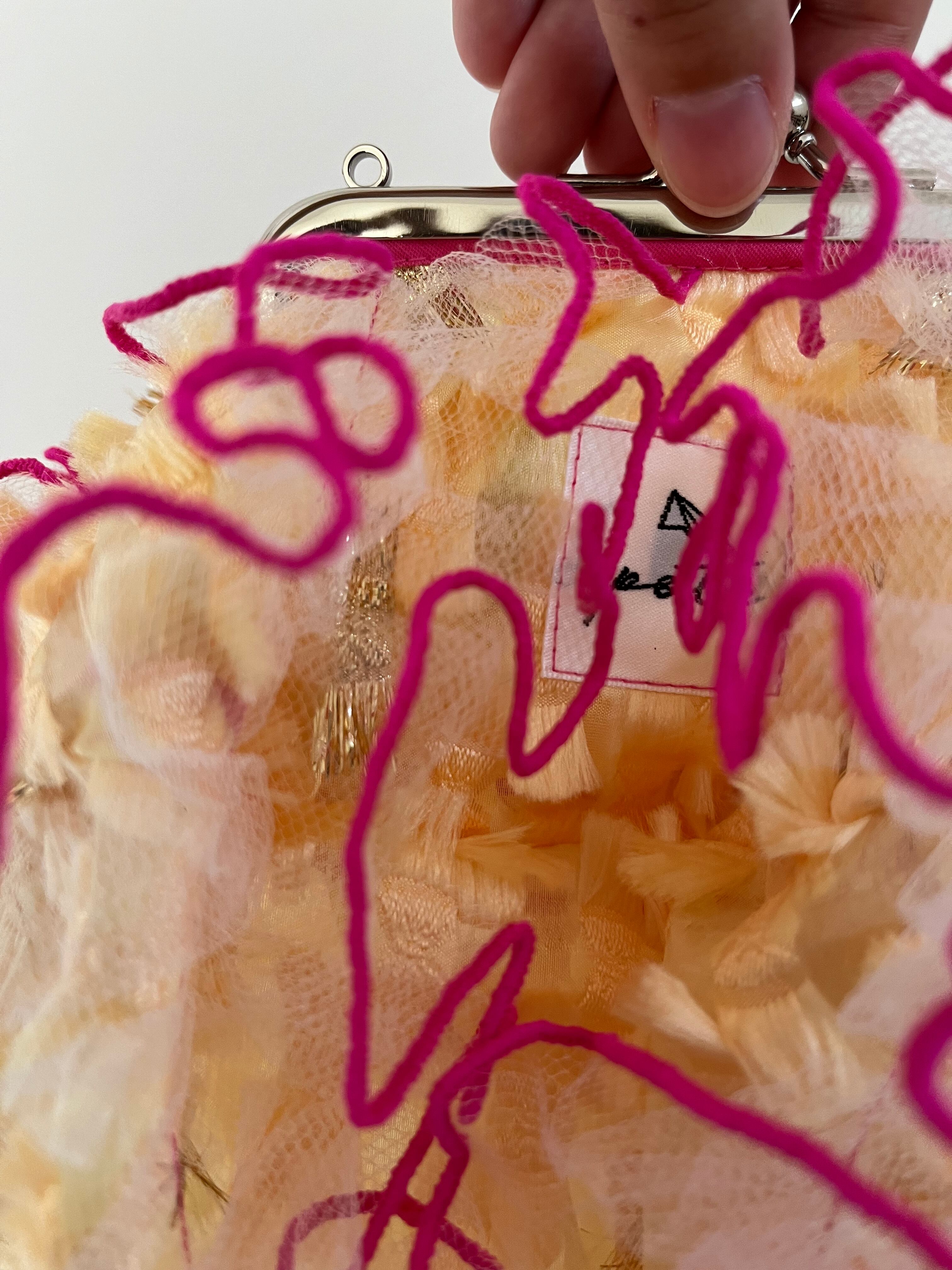 gamaparaは、華やかなチュール素材が印象的ながま口bagです。ワンピースやパンツスタイルにも合わせられるカラフルでインパクトのあるデザインが、コーディネートのアクセントになります。