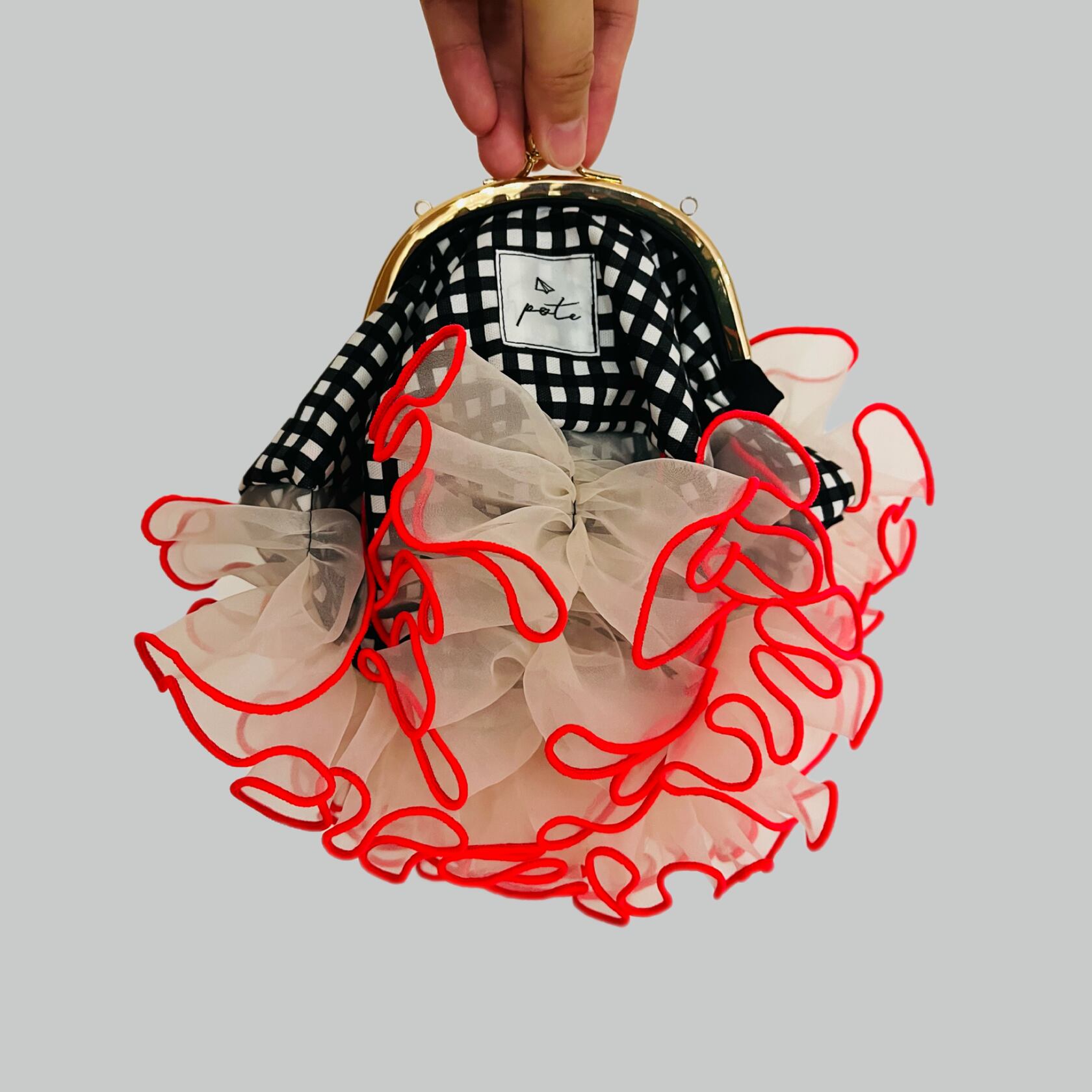 gamaparaは、華やかなオーガンジー素材が印象的ながま口bagです。ワンピースやパンツスタイルにも合わせられるカラフルでインパクトのあるデザインが、コーディネートのアクセントになります。